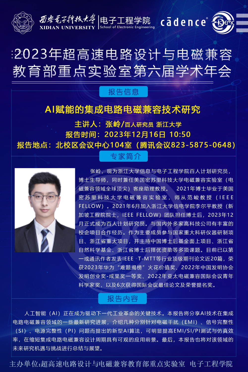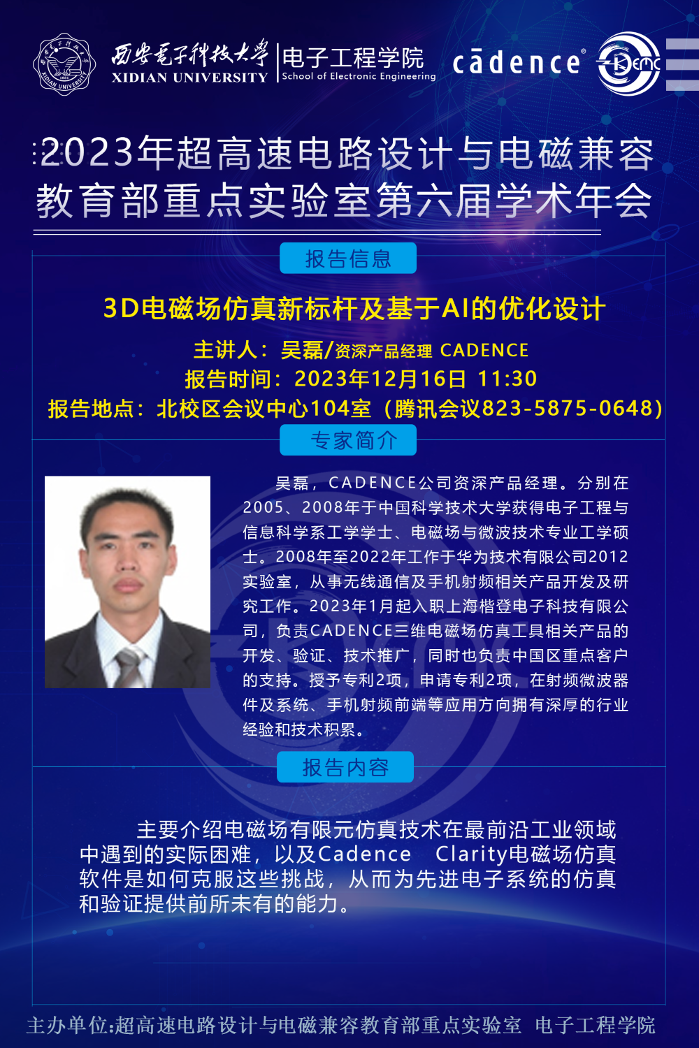 超高速電路設計與電磁兼容教育部重點實驗室第六屆學術年會將于12月16-17日在北校區會議中心104室舉行,騰訊會議(82358750648)線上同步進行。會議邀請了上海交通大學金晶研究員、浙江大學張嶺研究員、北京集天微電子丁同浩、深圳中興微電子高速互連總工程師吳楓、Cadence 系統仿真事業部資深產品經理吳磊等五位相關領域知名專家學者做特邀報告,以及8位優秀青年學者做相關課題匯報交流,還有14位優秀學生論文匯報。歡迎廣大科研工作者入會交流。