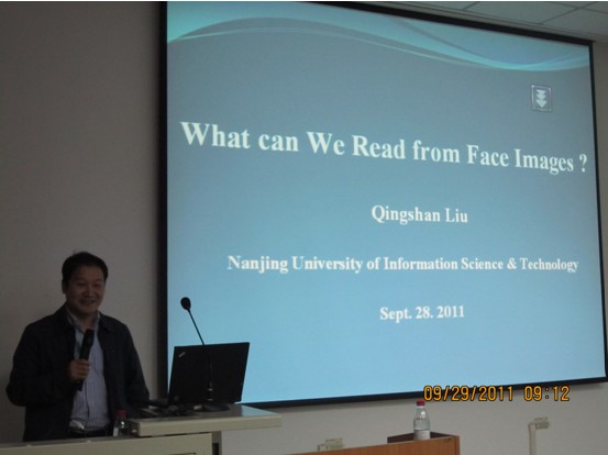 9月29日上午,在電子工程學院報告廳劉教授首先做了題為“What can we read from face images”的學術報告。劉教授首先簡要介紹了他所從事學術領域的研究現狀及發展前景,給出了他所帶領的課題組在人臉表情識別、人臉配準、人臉畫像識別、醫療圖像分析、視頻事件的檢測與分析等方面的研究進展與成果。