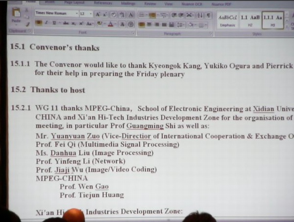 MPEG組織在大會決議文件中感謝會議主辦方電子工程學院 和MPEG-CHINA等組織者