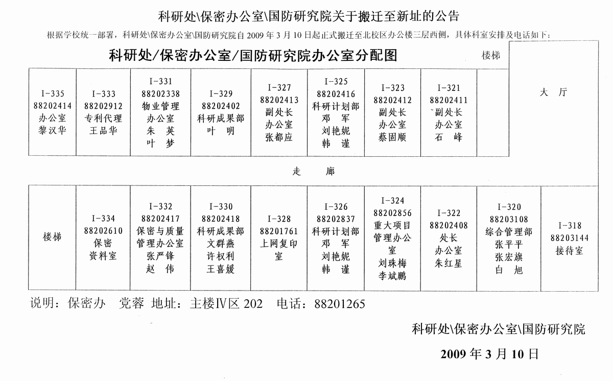 科研處、保密辦公室、國防研究院辦公地點和電話 2009-09-07 10:02:00 瀏覽次數: 文字版的看這里http://www.hetaojiu.org/news/newsshow.asp?id=2434 上一篇文章:國立臺灣大學王暉博士來我校進行學術交流 下一篇文章:西電與法國圖爾大學簽訂校際友好合作交流協議