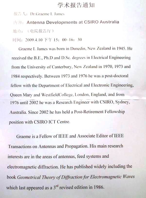 Dr.Graeme L James天線學術報告會 2009-04-09 20:37:00 瀏覽次數: 報告人:Dr.Graeme L James 內容:Antenna Developments at CSIRO Australia 地點:(電院報告廳) 時間:2009.4.10 下午 15:00—16:30 電院網絡中心拍攝 上一篇文章:關于2008年度校優秀科研成果獎異議的公告 下一篇文章:名人名家講壇:中國文明正源的歷史形成