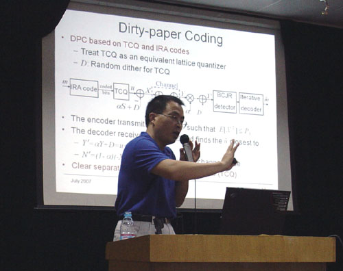到訪期間,通信工程學院、電子工程學院以及國際合作與交流處的領導會見了熊子祥教授;通院與電院的教師與熊子祥教授進行了座談,雙方就進一步的合作與交流交換了意見。熊子祥教授還為全校師生作了題為“Wyner-Ziv and dirty-paper coding: Duality, limit-approaching code designs and applications”的學術報告。他在報告中詳細介紹了網絡信息論中兩類常見的問題:二次高斯Wyner-Ziv編碼與dirty-paper編碼,重點講述了Wyner-Ziv編碼在視頻壓縮和接收機協同工作中的應用,以及dirty-paper編碼在圖像數據隱藏和高斯廣播信道編碼中的應用。